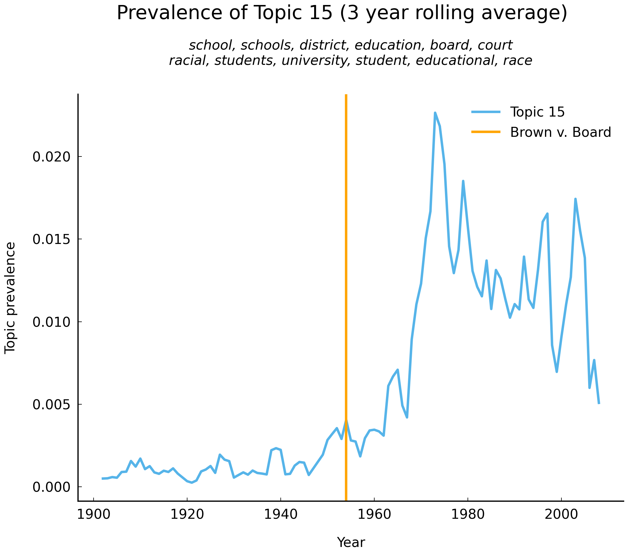 This chapter describes how a mixed-membership model can roughly identify the subject(s) of decisions without direct supervision or labeling by human readers. To give some sense of where we are headed, consider Fig. 17 below, which shows for each year between 1903 and 2008 the proportion of all words in opinions related to a “topic” characterized by the frequent occurrence of words such as school, race, voting, education, and minority. (The way the model identifies these particular words is described in section Parameter estimation.) Those familiar with United States history will not be surprised to see that the number of decisions associated (in a manner to be described shortly) with this constellation of frequently co-occurring words (school, race, voting, education, and minority) increases dramatically in the late 1950s. The orange vertical line shows the year 1954, the year of the decision Brown v. Board of Education of Topeka (347 U.S. 483). This decision ruled that a school district (the governmental entity responsible for education in a region of a US state) may not establish separate schools for black and white students. Brown v. Board of Education of Topeka was one among several decisions related to minorities’ civil rights and voting rights: the 1960s and the 1970s witnessed multiple legal challenges to two signature laws addressing concerns at the heart of the civil rights movement in the United States: the Civil Rights Act of 1964 and the Voting Rights Act of 1965.